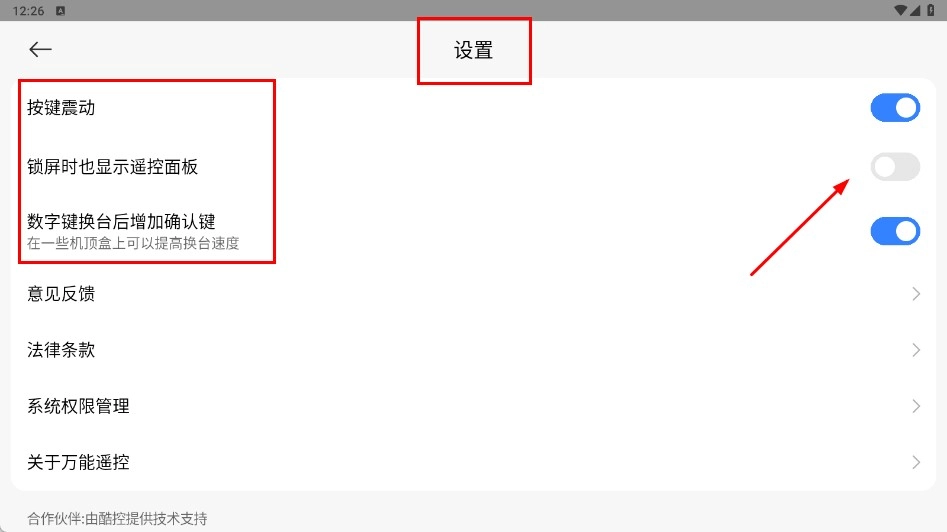 4、在设置界面,可对按键震动、锁屏显示遥控面板等功能进行开关设置。