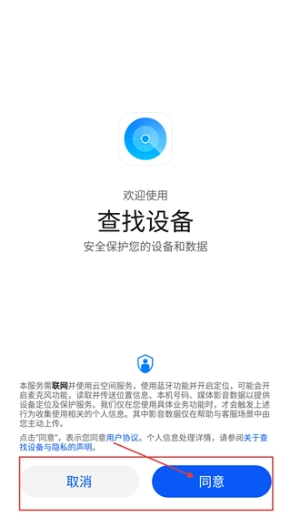 1、进入【查找设备】应用后,点击【同意】按钮即表示接受,可启用设备定位、数据保护等功能。