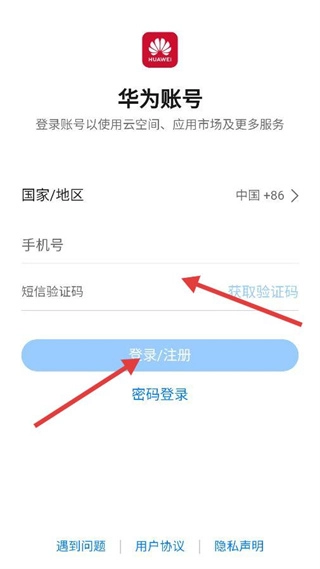 3、在短信登录页,选择【国家/地区】,输入【手机号】并获取验证码,填写后点击【登录/注册】即可完成账号验证。