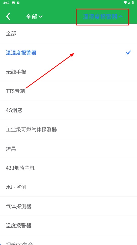 2、选择【温湿度报警器-设备类型】选项,以此对设备展开筛选操作。