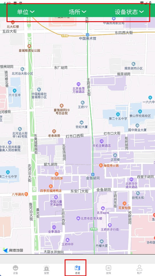 4、进入【总览-界面】,借助【单位-场所-设备状态-筛选栏】,查看设备的分布情况与状态信息。