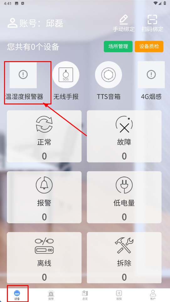 1、在【设备-界面】中,点击【温湿度报警器】图标,即可进入设备管理流程。