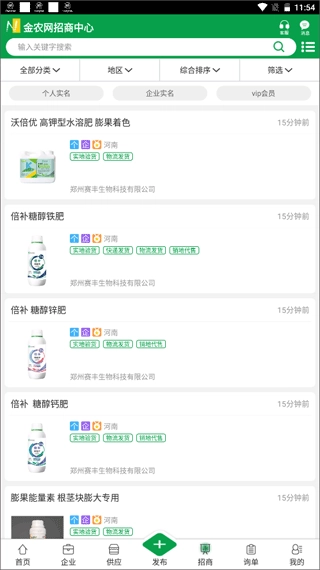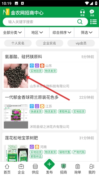 1、在金农网首页底部找到【招商】按钮并点击,进入招商中心后,就能查看各类农业招商产品的相关信息。