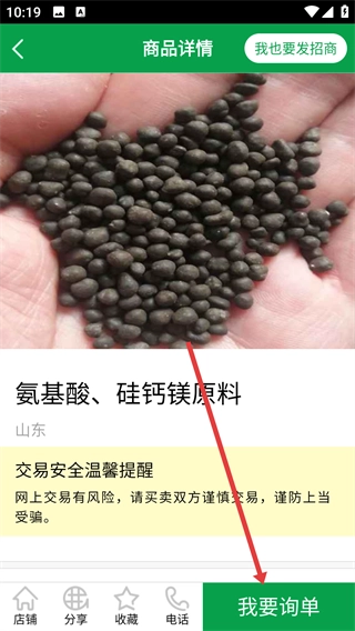 2、在招商中心页面,点击目标产品(例如【氨基酸、硅钙镁原料】这类产品),即可进入对应的商品详情页。