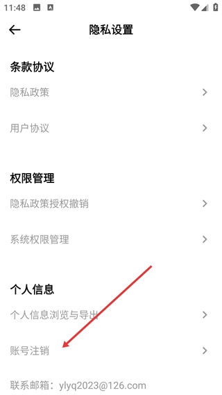 3、进入隐私设置页面后,点击【账号注销】选项,仔细阅读并查看账号注销的相关告知内容。