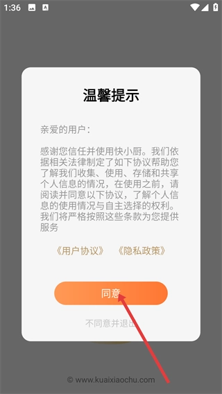 在快小厨弹出的【温馨提示】窗口里,点击【同意】按钮以接受《用户协议》与《隐私政策》,进而继续使用相关服务。