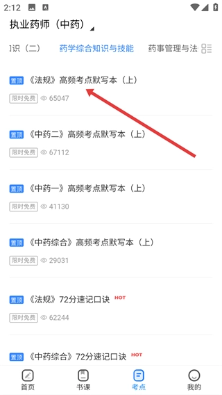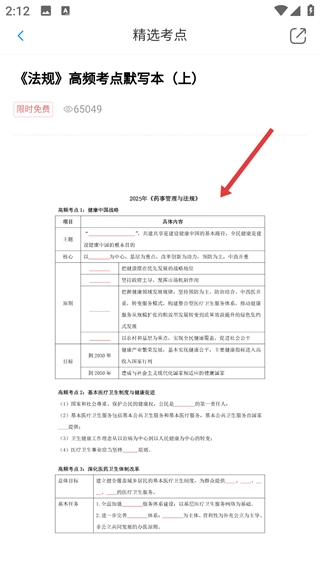 4、进入后可查看《法规》高频考点默写本(上)的精选考点,如2025年《药事管理与法规》的高频考点内容,进行考点学习。