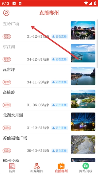 3、进入【直播郴州】板块,可选择如【五岭广场】【东江湖】等直播地点,点击即可查看对应直播内容。