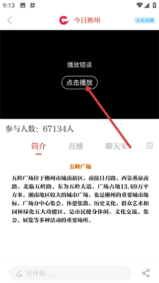 4、若遇到【播放错误】,点击【点击播放】按钮可尝试重新播放,还可查看直播简介了解相关地点信息。