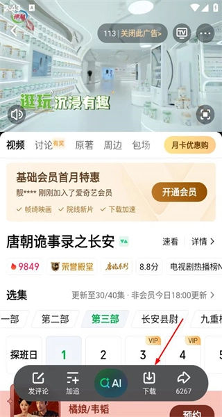 在《唐朝诡事录之长安》的播放页面,点击按钮后会弹出设置选项,页面上同时还展示着会员特惠、剧集更新等相关信息。