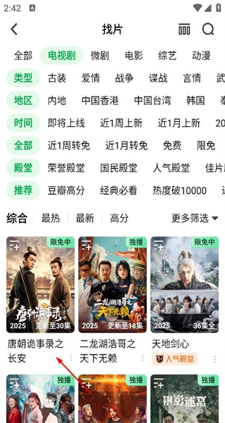 1、启动软件后,进入找片界面,选择电视剧分类,找到《唐朝诡事录之长安》,点击进入该剧的播放页面。