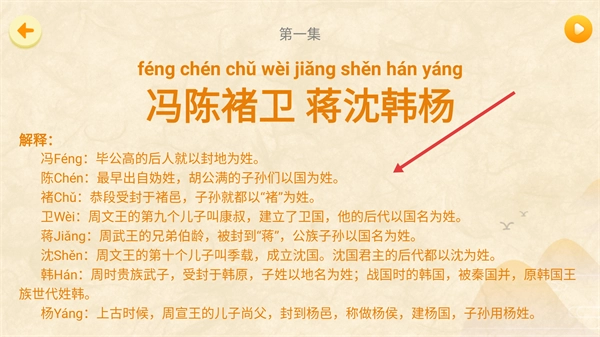 4、学习“冯陈褚卫 蒋沈韩杨”等姓氏的相关知识,完成《百家姓》第一篇第一集的学习任务。