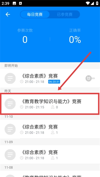 2、进入竞赛页面后,选择《教育教学知识与能力》竞赛场次,该场次答题时间为21:00-21:15。