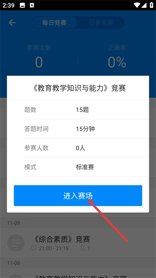 3、点击选中的竞赛场次后,在弹出的竞赛信息框中,点击【进入赛场】按钮,即可参与该竞赛。