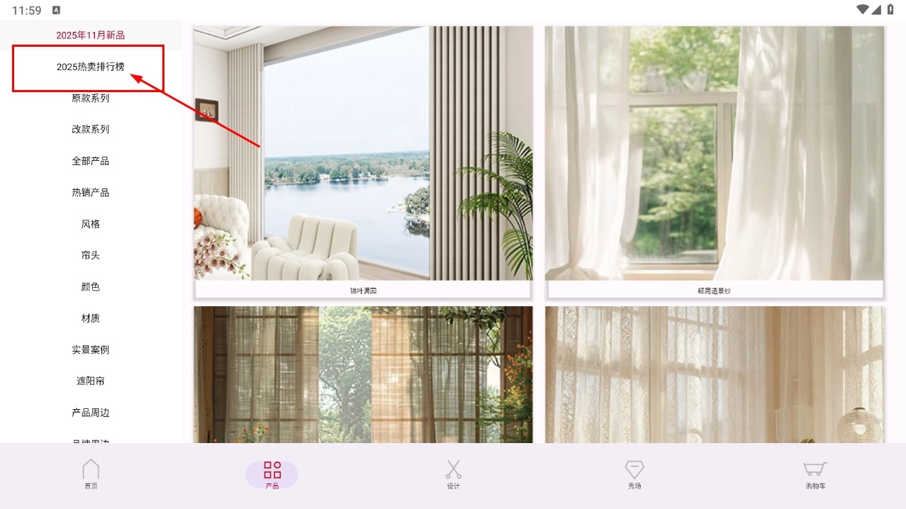 2、进入产品分类后,找到并选择【2025热卖排行榜】这一选项,即可浏览当下热门的窗帘款式。
