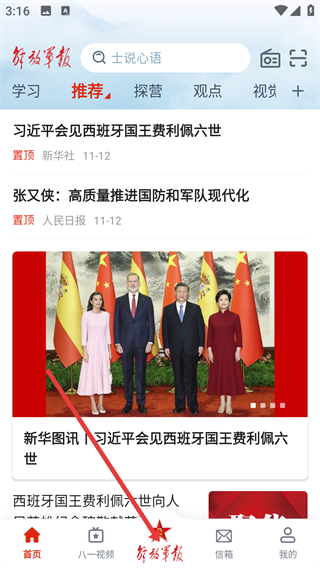 1、打开软件后进入【首页-推荐】页面,点击底部导航栏的【解放军报】图标。