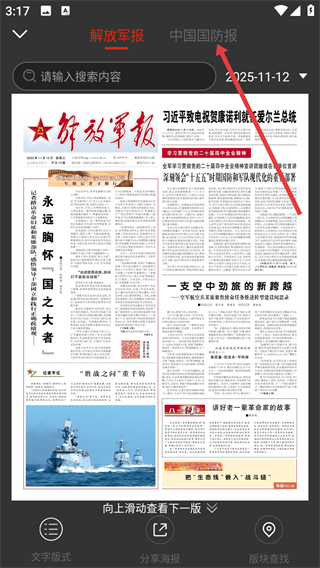 2、在解放军报的海报页面,点击【中国国防报】,可查看不同日期的中国国防海报。