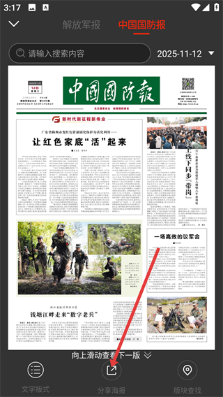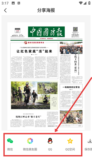 3、在《中国国防报》阅读界面,点击底部【分享海报】按钮,可进入海报分享页面。