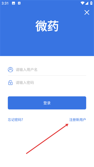 2、在微药的登录页面找到【注册新用户】按钮并点击,即可进入注册界面。