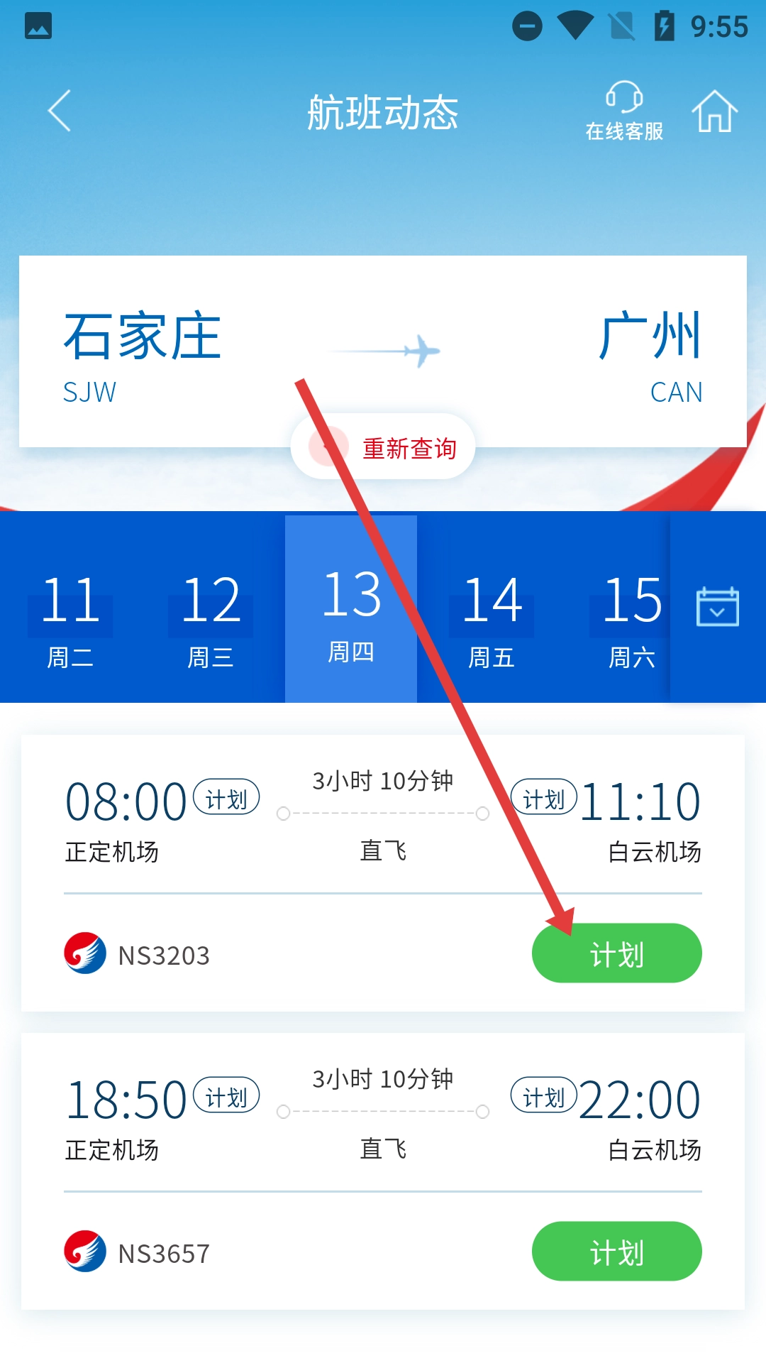3、在航班动态页面,选择具体航班,点击【计划】按钮,可查看该航班的详细动态。