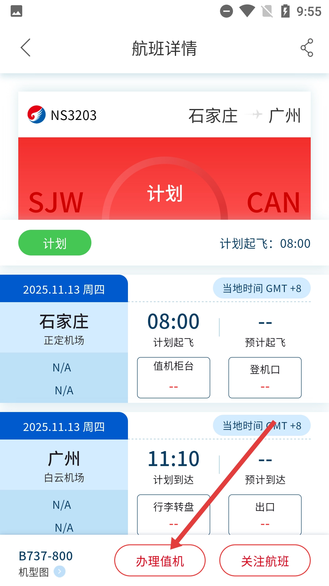 4、进入航班详情页后,可点击【办理值机】按钮,进行值机操作。
