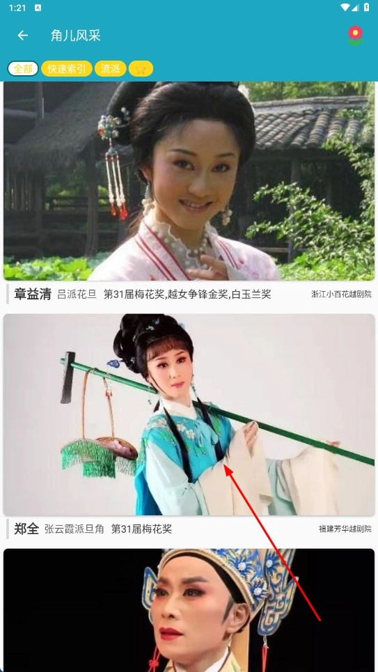 2、进入角儿风采页面后,挑选你感兴趣的越剧演员,例如【郑全-演员名称】。