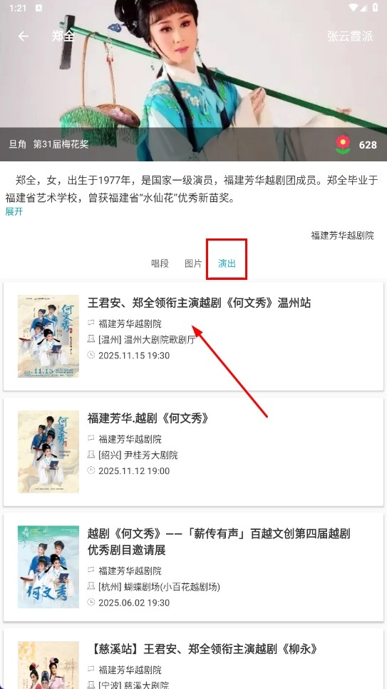 3、进入演员详情页后,点击【演出-功能标签】,即可查看该演员的演出信息,像越剧《何文秀》温州站这类信息都能看到。