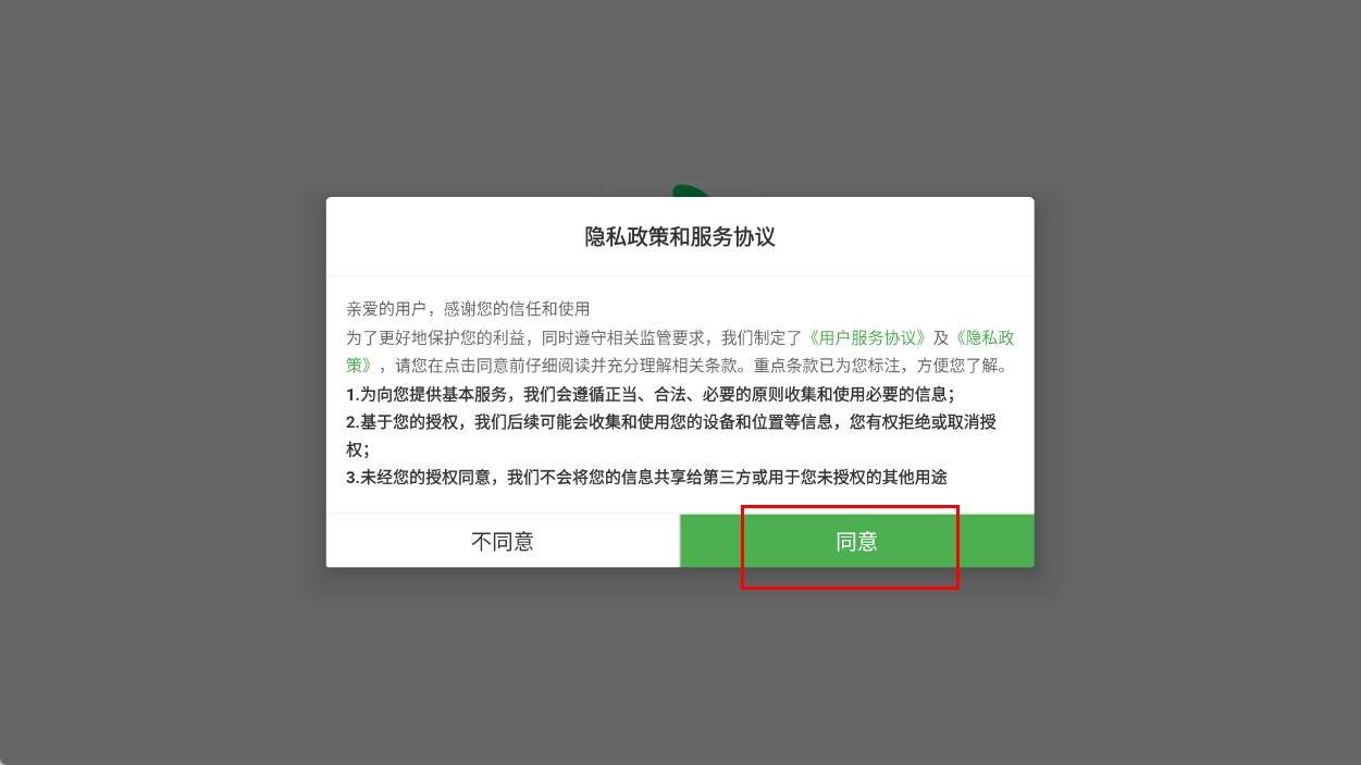 1、点击【同意-隐私政策和服务协议按钮】,进入登录界面。