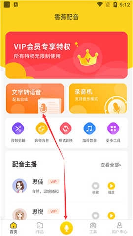 1、完成软件安装并打开后,在首页选择“文字转语音”功能,或是点击下方的“话筒”图标,就能启动配音制作流程。