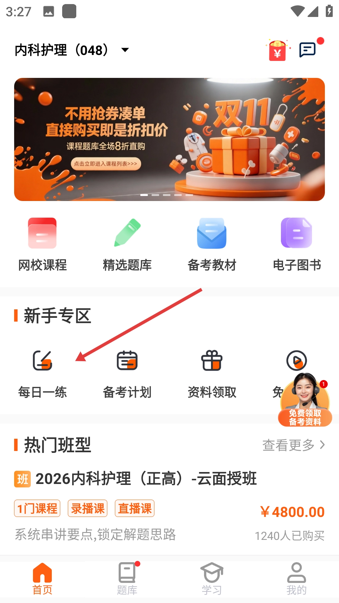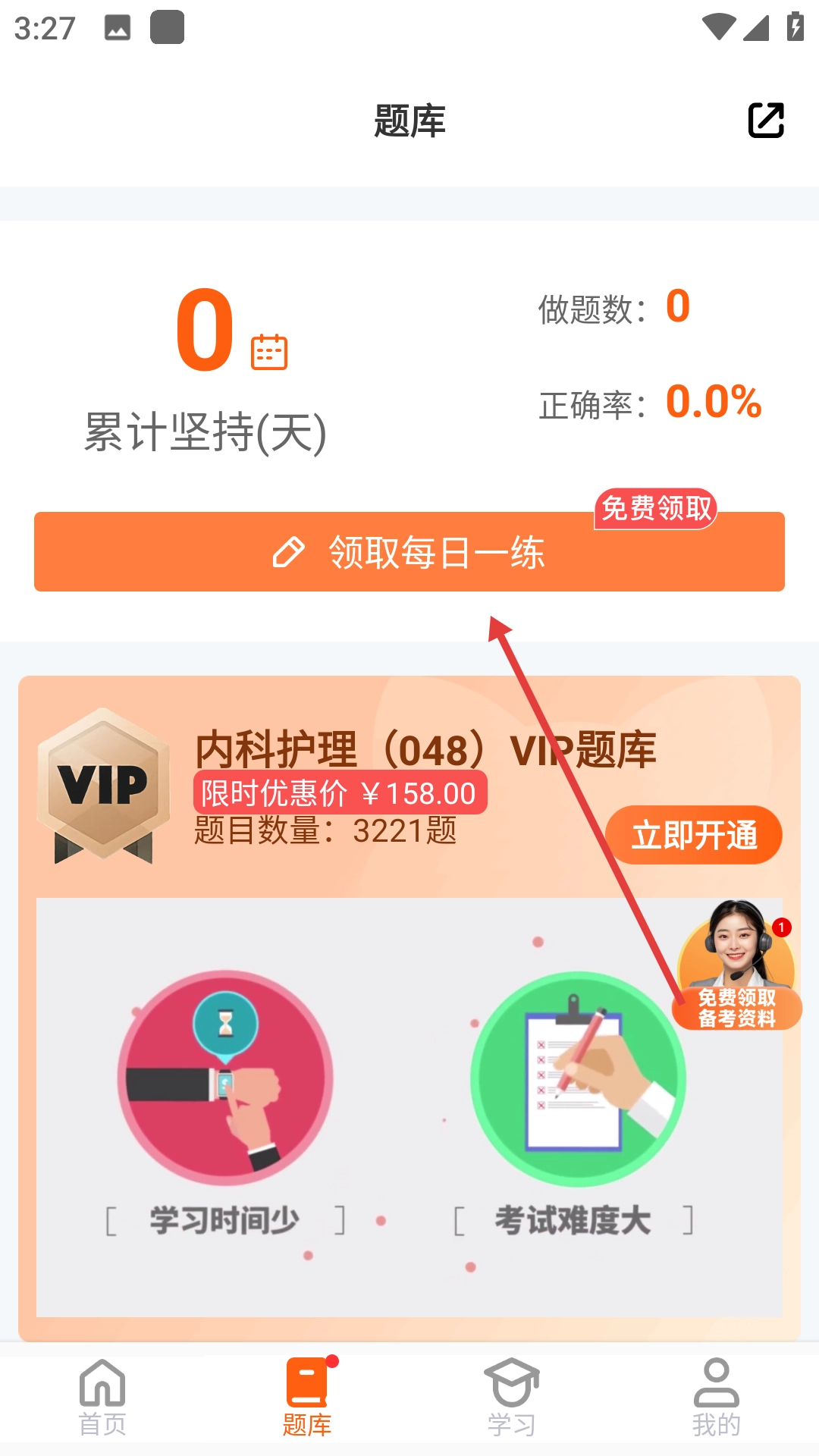 2、在首页点击【每日一练】,进入题库页面。