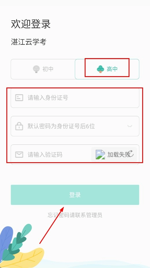 3、选择【高中-学段选项】,输入身份证号、密码及验证码,点击登录按钮完成登录。
