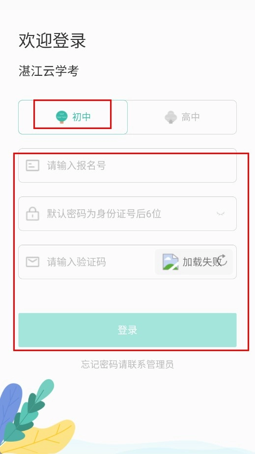 2、选择【初中-学段选项】,输入报名号、密码及验证码,点击登录按钮完成登录。