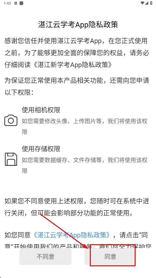 1、阅读《湛江云学考App隐私政策》后,点击【同意-按钮】,同意隐私政策及权限申请。