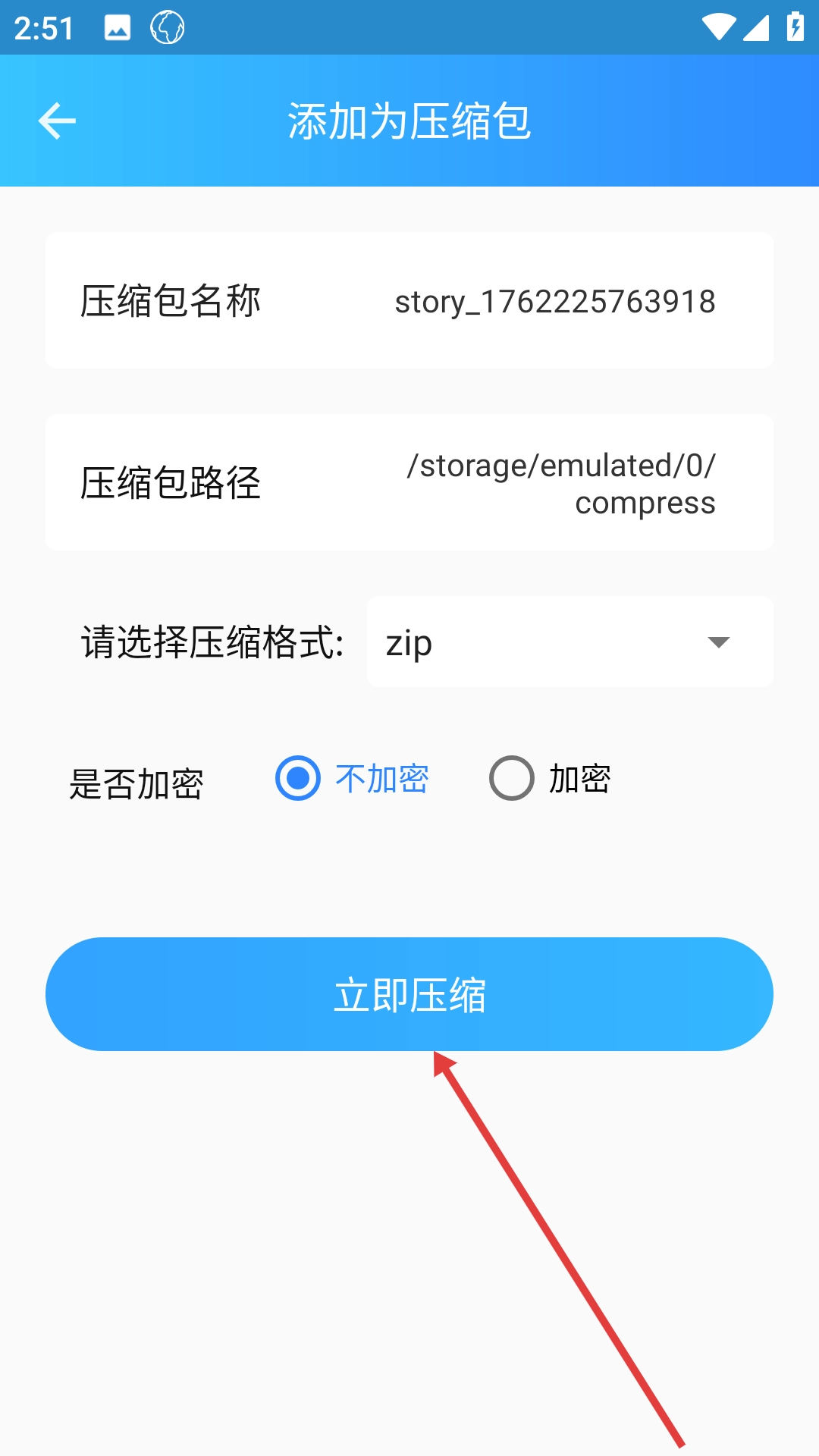 4、在添加文件至压缩包的页面中,确认好压缩包的名称、保存路径以及格式等相关信息后,点击【立即压缩】按钮,即可完成文件压缩的操作。