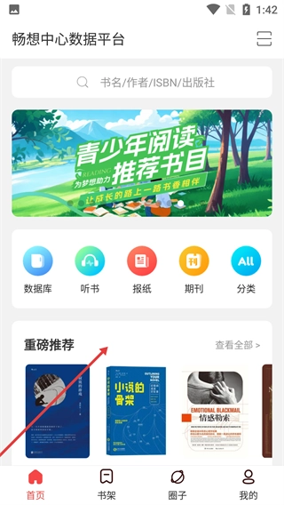 4、注册登录后进入【畅想中心数据平台】首页,可通过搜索框检索图书,也可使用【数据库】【听书】等功能。