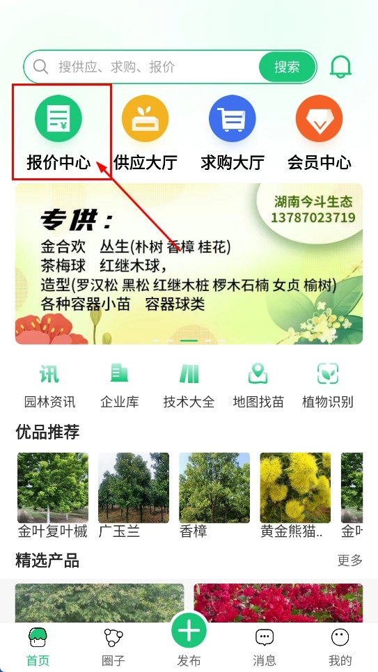 1、点击【报价中心-功能按钮】,进入报价中心页面,查看各类苗木报价信息。