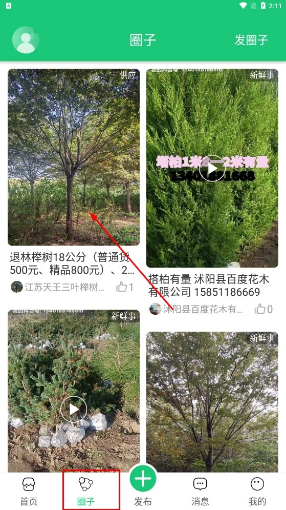 4、点击底部【圈子-功能按钮】,进入圈子页面,查看苗木供应、新鲜事等动态。