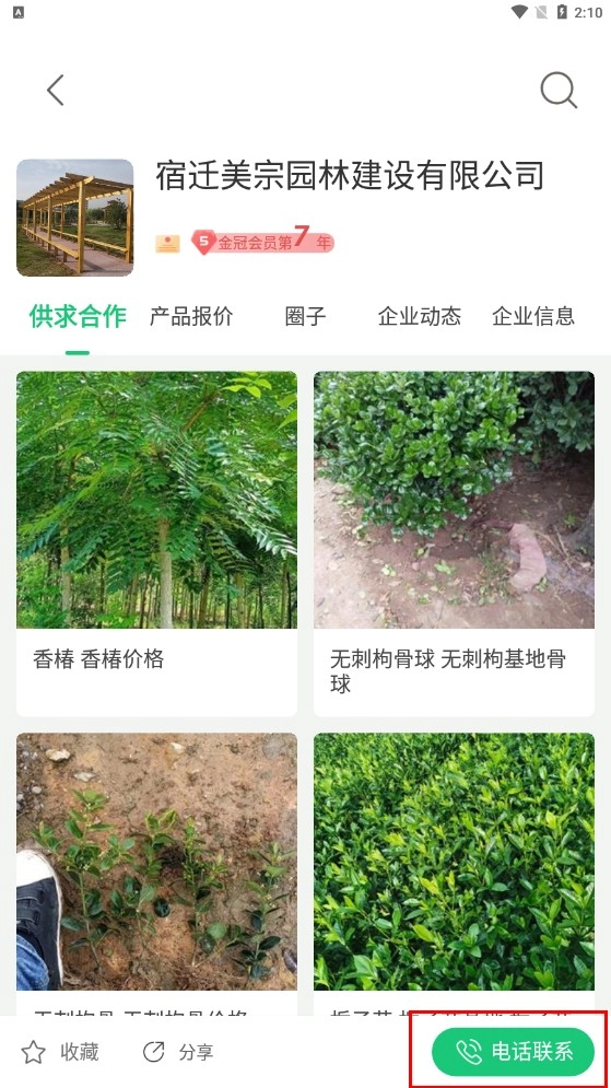 2、在报价中心页,点击苗木条目,可进入企业详情页,查看企业供应的苗木产品。