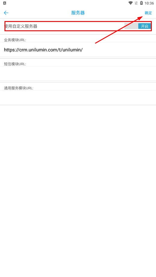 4、进入服务器设置页面后,可开启【使用自定义服务器-功能按钮】,设置相关URL后点击【确定-功能按钮】保存。