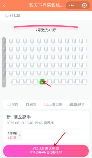 4进入选座页面后,选定自己喜欢的座位,点击确认按钮,再完成支付环节,就能顺利买到票了。