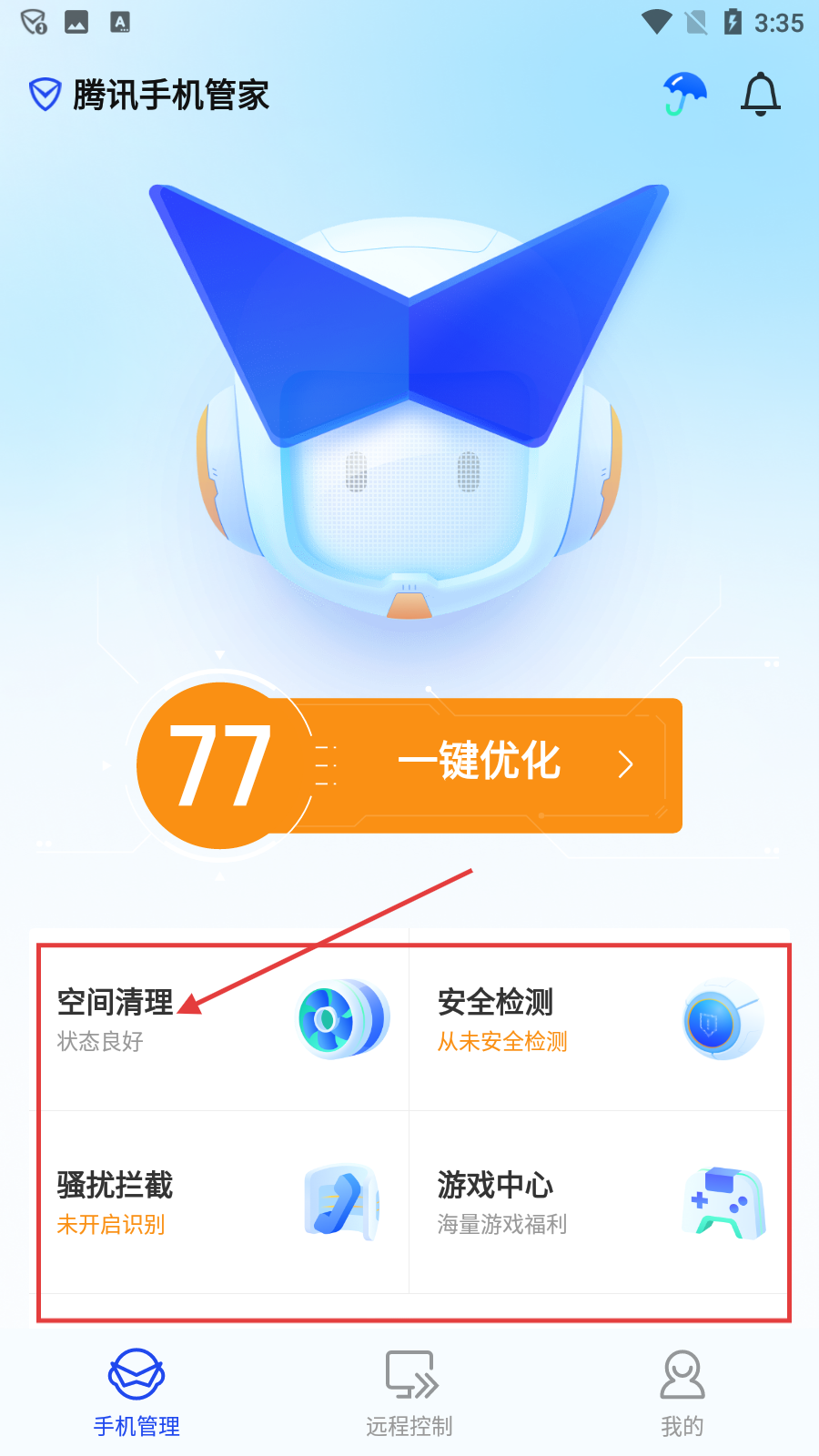 1、启动【腾讯手机管家】应用后,进入手机管理界面,找到并点击【空间清理】功能选项。