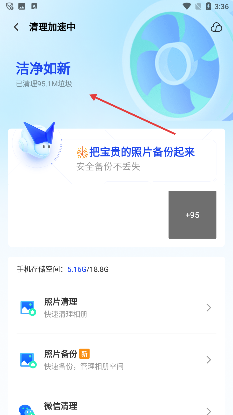 4、清理结束后,页面会呈现“洁净如新”的提示,并显示已清理垃圾的大小。