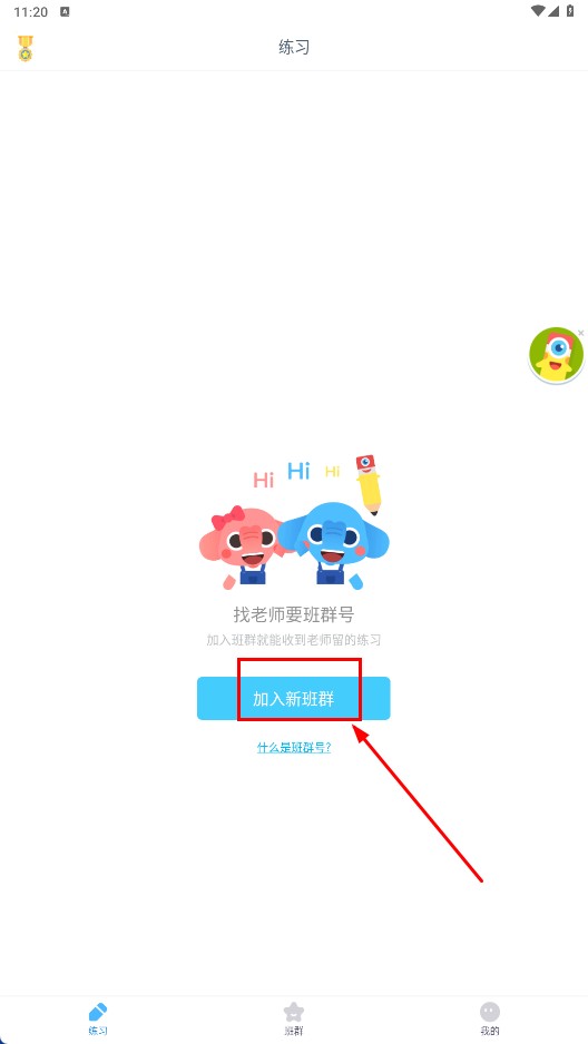 3、进入练习页面后,点击【加入新班群】功能按钮,即可进入班群加入页面。