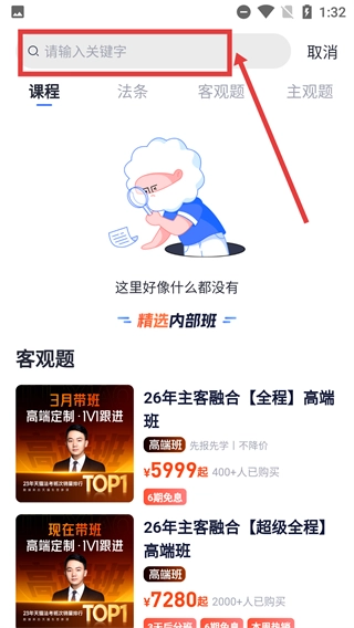 1、在首页点击右上角的【搜索】图标,进入搜索页面后,即可开始查找法考相关内容。