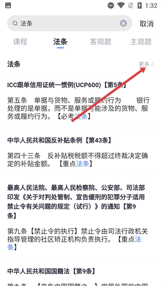 在搜索结果页面切换至【法条】标签后,点击【更多】按钮,即可查看更多法条列表。