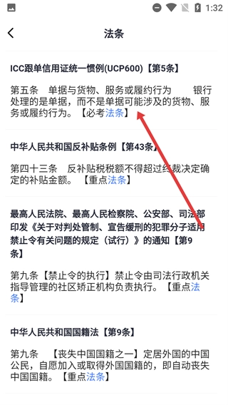 4、在法条列表里找到并点击目标法条(例如ICC跟单信用证统一惯例(UCP600)【第5条】),即可查看该法条的详细内容,进而学习那些属于必考范围的法条知识。