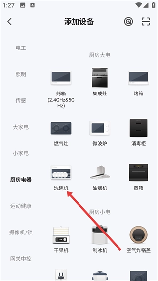 3、在厨房电器列表里,点击【洗碗机】这一选项,就能进入洗碗机的添加流程。