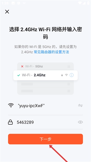4、选择2.4GHz频段的【Wi-Fi】网络,输入对应的密码后点击【下一步】按钮,即可继续进行设备添加的后续操作。