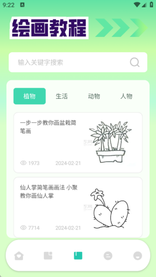 3绘画教学页面设置了植物、日常事物、动物与人物等不同主题分类,同时支持通过关键词检索功能查找所需内容。