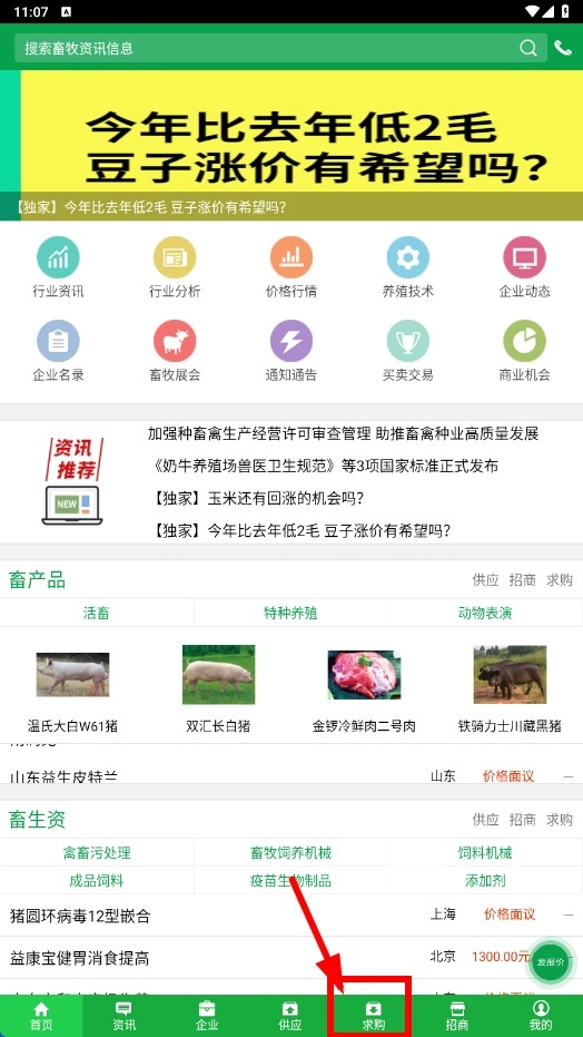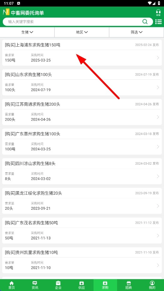 1、点击底部的【求购】功能按钮,进入求购页面即可查看生猪求购信息,例如上海浦东求购150吨生猪这类信息。